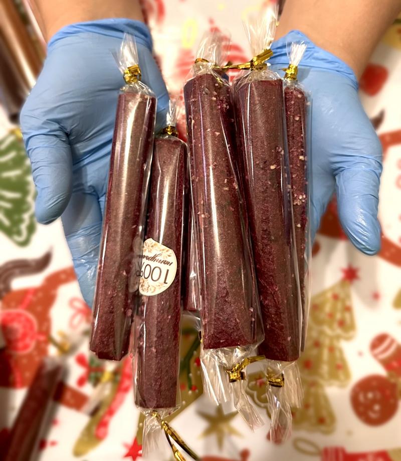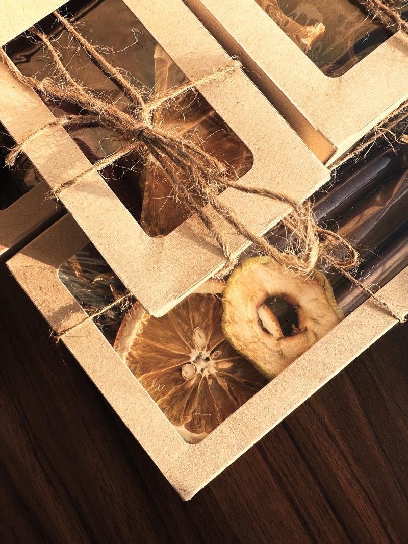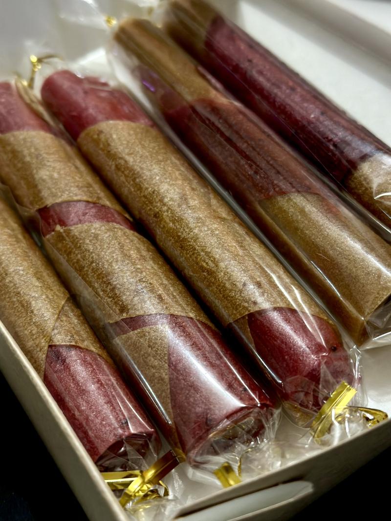 Нежнейшая домашняя пастила без сахара для угощения из фруктов и ягод со своего огорода. Упакована в подарочную пленку и крафтовые коробочки с орехами и сушеными фруктами.